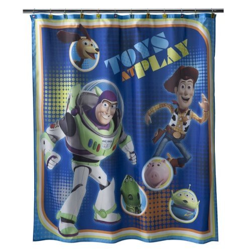 Disney Toy Story Sunnyside Toys At Play Fabric Shower Curtain - 70x72 Inches. Delight your children when you Update the look of their bathroom with this Toy Story shower curtain. The blue curtain features characters from the Disney movie. Look for coordinating bath accessories. 100% Polyester, Machine Wash Cold, Do Not Bleach, Line Dry.You will not be disappointed with