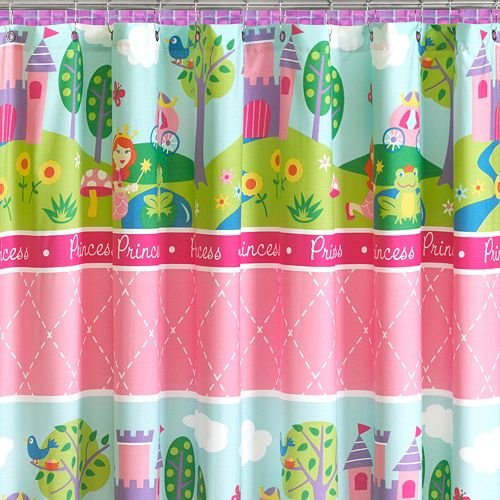 The Enchanted Castle shower curtain has colorful illustrations of crowns, castles, carriages and even a frog. It features reinforced gromments and is machine washable for easy care.You will not be disappointed with